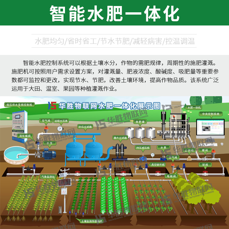 产品简介:水肥一体化就是通过灌溉系统施肥,作物在吸收水分的同时吸收养分。溶有肥料的灌溉水,通过灌水器,将肥液喷洒到作物上或滴入根区。这样肥料会更容易被吸收,得到充分利用,肥料利用率会大大提高。