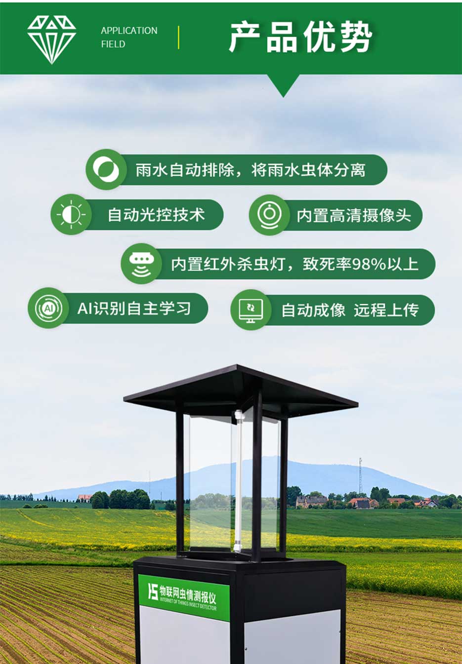产品简介:华胜物联网虫情测报仪通过构建一套完整的害虫监测及预警系统,集成了害虫诱捕、拍照、环境信息采集、数据传输、数据分析等功能于一体,实现了害虫诱集、分类统计、实时报传、远程检测、虫害预警和防治指导的自动化与