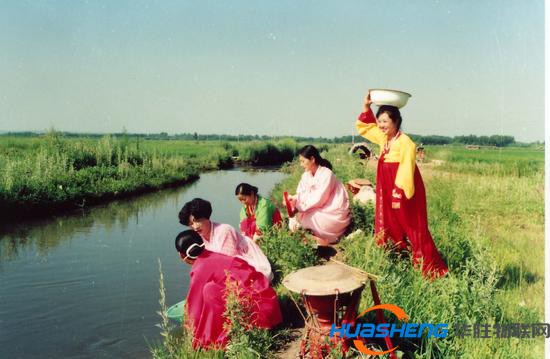 2007年6月19日,朝鲜族丹敖节,朝鲜族姑娘身着节日盛装,在秀丽的水稻灌区旁边,载歌载舞